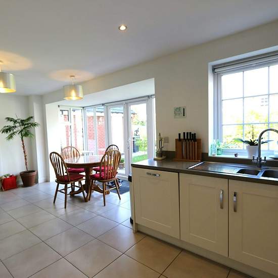 This well presented, four bedroom, detached house is situated on the popular Heathcote development, opposite Nuffield leisure centre and close to motorway connections, schools and local amenities. The property comprises spacious entrance hall with guest W.C housing under stairs storage. Off the hallway is a home office/study room and a large lounge with feature bay window. The good sized, bright kitchen benefits from a range of built in modern appliances and dining area with extended glass doors and windows leading out to a well maintained ...