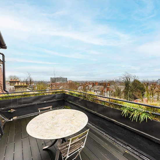 This exceptional apartment is arranged across three impressive floors of a semi-detached home in one of Hampstead’s most sought-after locations. Designed and built by Carl Haag, Queen Victoria’s Orientalist, the home showcases remarkable character throughout. A traditional spiral staircase rises to a minstrel’s gallery and continues to each level. Residents also benefit from a large, well-maintained communal garden and two south-facing terraces with ever‑changing views. The first floor offers four versatile bedrooms and two well‑proportioned...