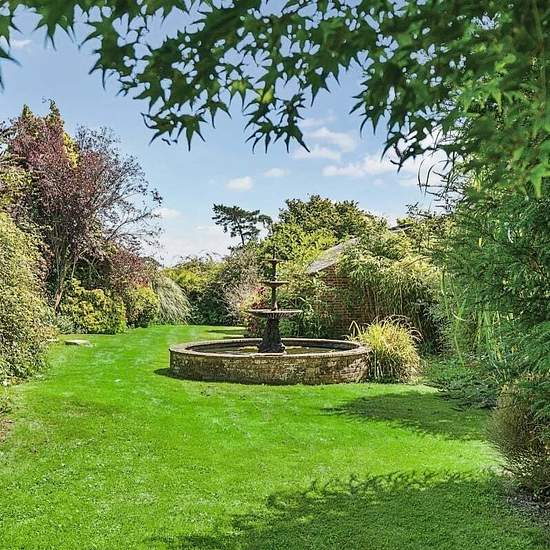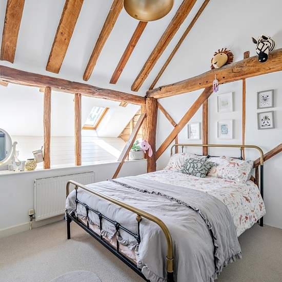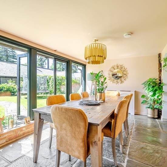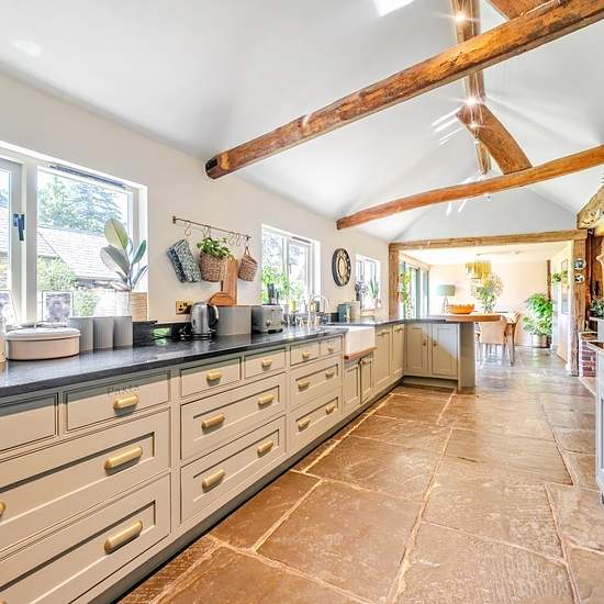 Nestled in an Area of Outstanding Natural Beauty, this stunning converted barn blends charm, space, and elegance. A striking reception hall with vaulted ceiling and double-height glazing sets the tone, leading to generous living areas. The character-filled sitting room features exposed beams, a wood burner, and flows into a vaulted garden room with doors to the terrace and landscaped gardens. An impressive double-aspect study/games room offers curved timbers, a wood burner, and garden access. The showpiece 'L'-shaped kitchen/dining room boas...