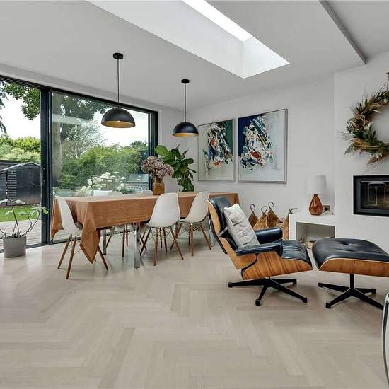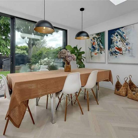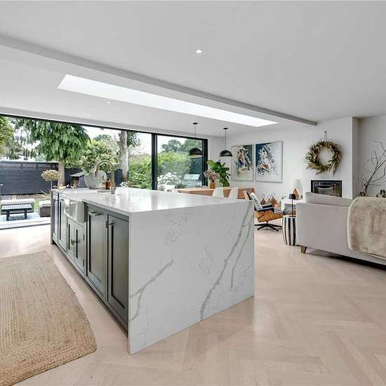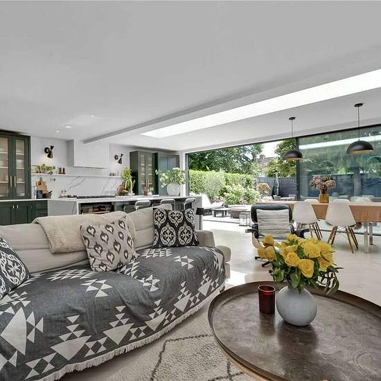 Upon entering, you are welcomed by a bright and spacious hallway with a guest WC. The front reception room features bespoke shelving and a warm, inviting atmosphere. To the rear, the property opens up into a stunning open-plan kitchen, dining, and living area. This space is flooded with natural light through the expansive sliding doors and a overhead skylight. The kitchen is a true showstopper, complete with a central island featuring a wine cooler, luxurious marble countertops, and forest green cabinetry accented with elegant gold hardware....