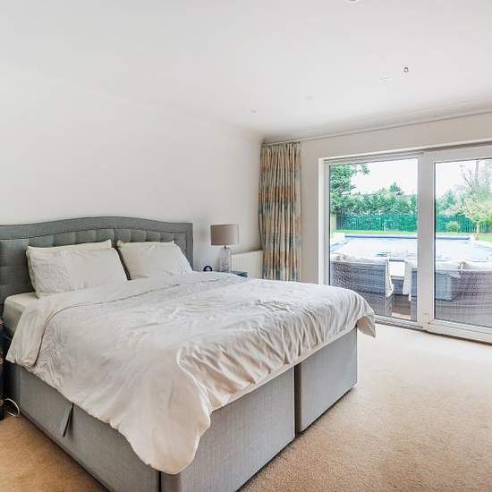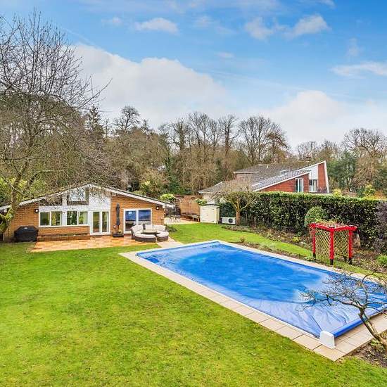 This substantial six bedroom detached property is located at the end of a private road. in a secluded spot. In addition to the six bedrooms the accommodation comprises a modern kitchen/breakfast room that flows into a dining area, utility room, 26' living room, three bath/shower rooms and even a sauna! Outside there is a beautiful and superb size rear garden with swimming pool, internal courtyard which is perfect for evening entertaining, ample driveway parking and a double garage. The property is located in Mayford, a short drive from both ...