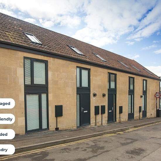 ROMANS: Step up a few steps from the street into the luxurious, modern open-plan kitchen and dining area, featuring a large corner sofa and flat-screen TV. The fully equipped kitchen includes a washer-dryer and dishwasher, making daily living effortless. Upstairs, you'll find a landing with additional storage, leading to one king bedroom with an en-suite shower room, one double bedroom, and a shared shower room. Each space has been thoughtfully designed to offer you a blend of modern comfort and historic charm in this beautiful city.