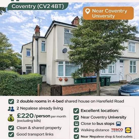 **Double Room Available in Coventry (CV2 4BT)!** * **Rent:** £220 per person * **Available:** Immediate move * **Features:** Furnished, Wi-Fi included Perfect for students or professionals looking for a comfortable place to stay. **Message me for more details or to arrange a viewing!**