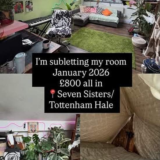 Subletting my room in warehouse N15 4QN 24th December - 1st Feb —£800 all in— Clean house with weekly cleaner Jacuzzi Cinema//Living room Music Studio Friendly housemates creative & professionals