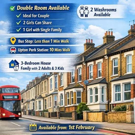 £850 pounds Contact for more details: +89339 +06893 Room Available in Green Street, London (UK) Double Room Available Suitable for a couple 2 Girls can share 1 Girl can share with a single family 2 Washrooms Available Location Advantages: Bus stop: Less than 1 minute walk Upton Park Station: 10 minutes walking distance House Details: • 3-Bedroom House • Living with a family (2 adults + 3 kids) • Calm and family-friendly environment Available from: 1st February